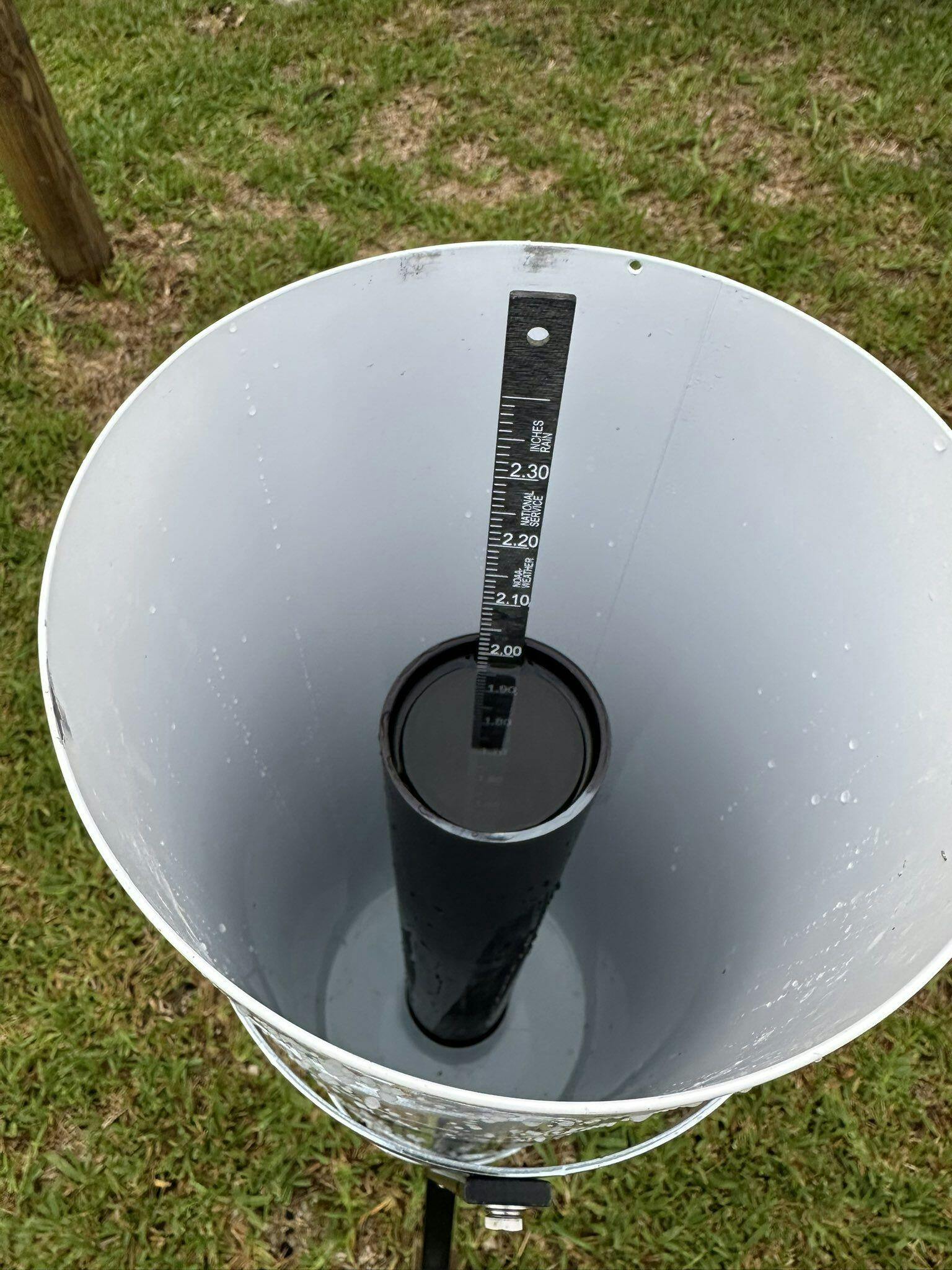 When used as a snow gauge, the receiver and funnel are removed. Snowfall is collected in the overflow can and melted for measurement with the receiver and dipstick.